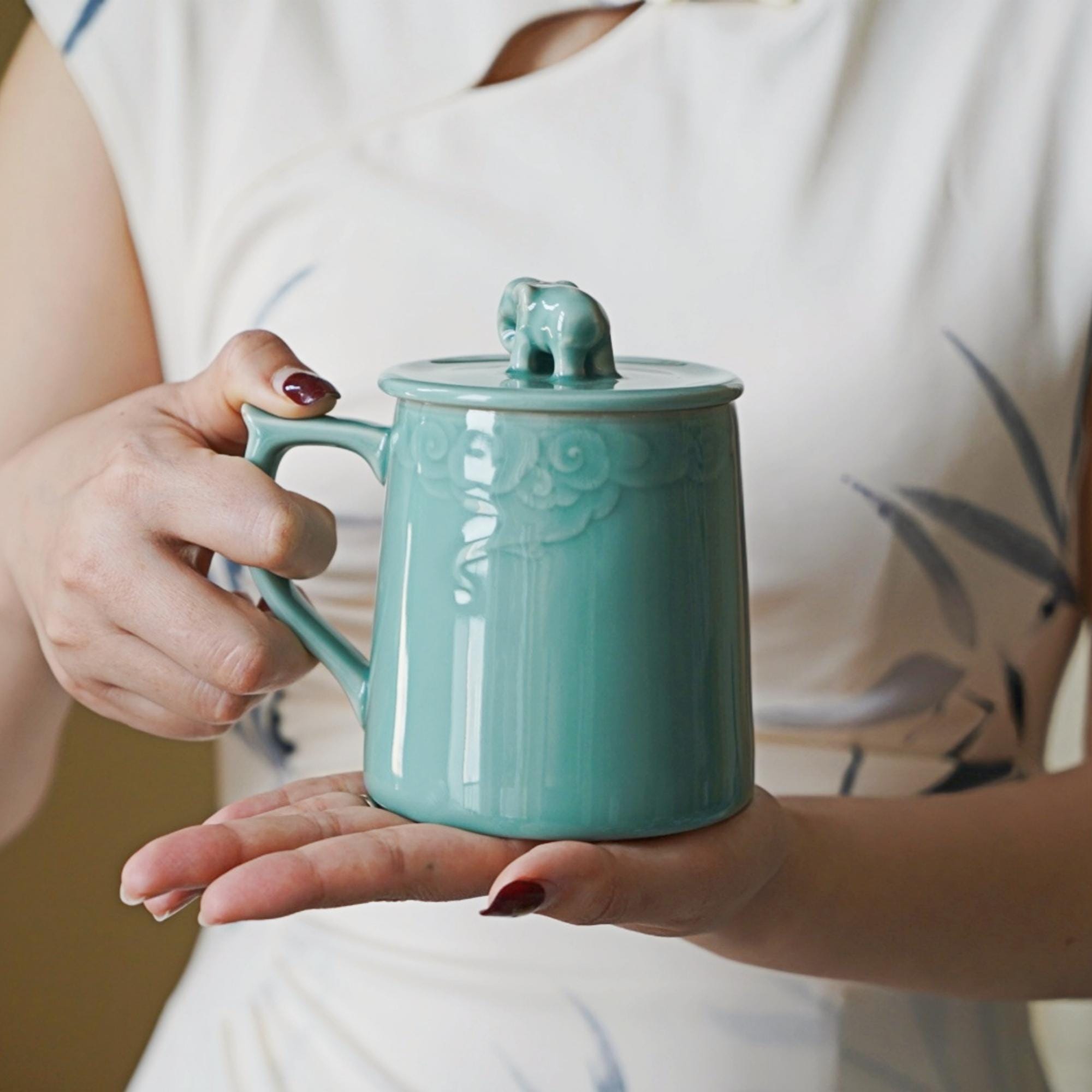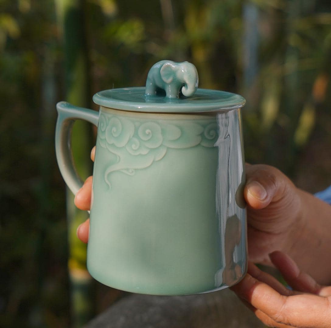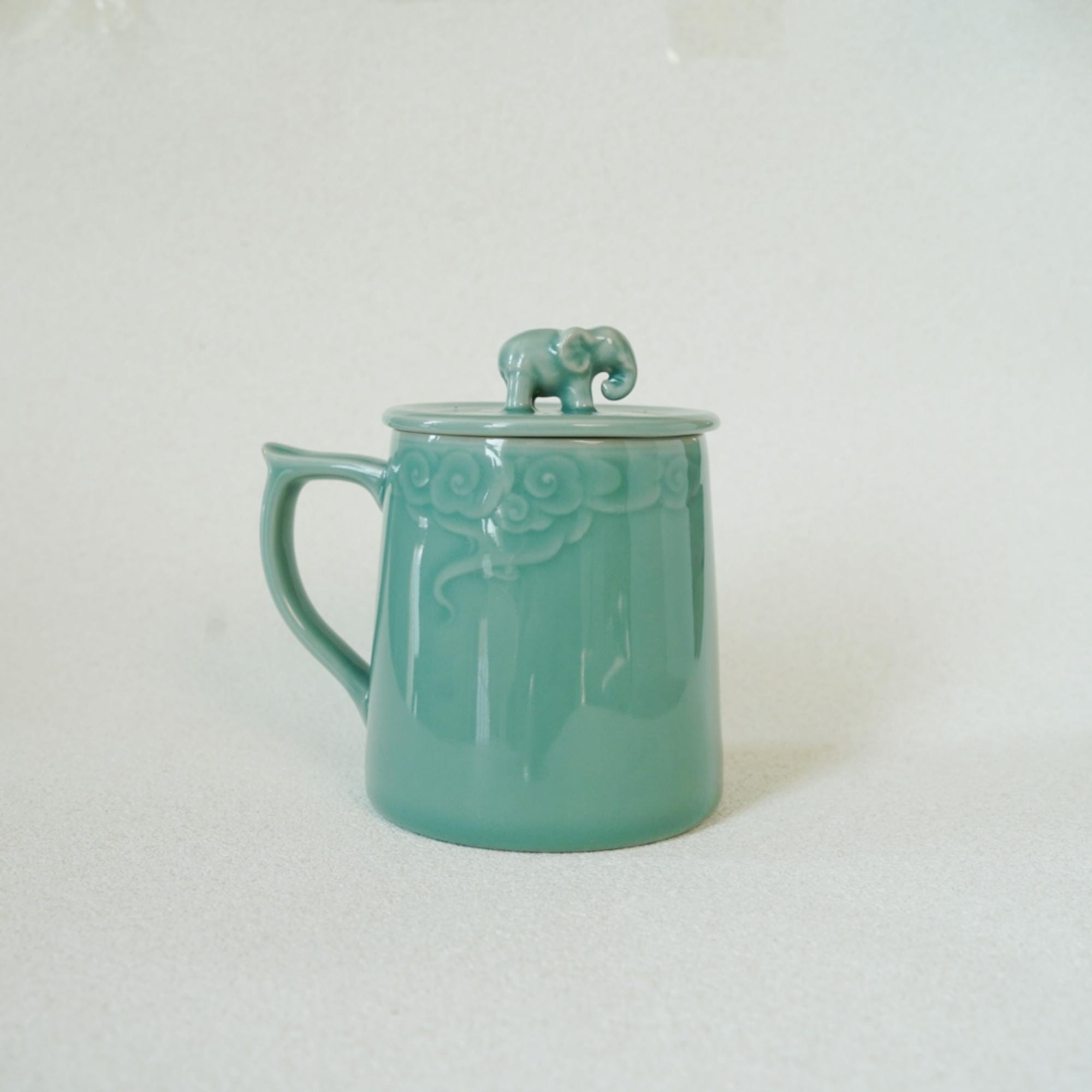 Cloud Blessing Mug · 12oz Celadon Ritual Tea Cup with Elephant Lid | Longquan Handmade Mug with Cloud Carving | Zen Gift of Strength & Peace