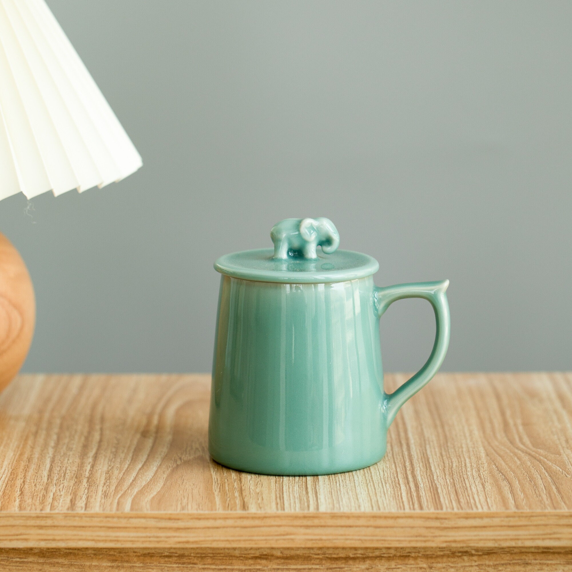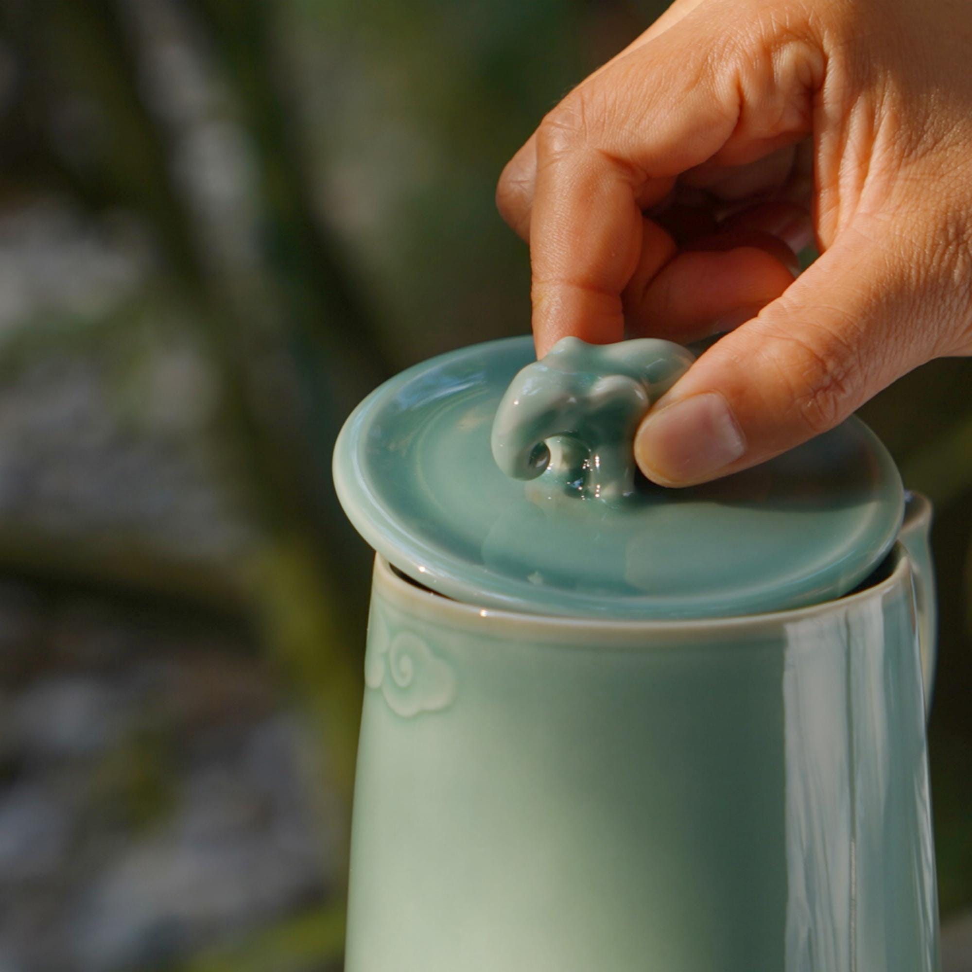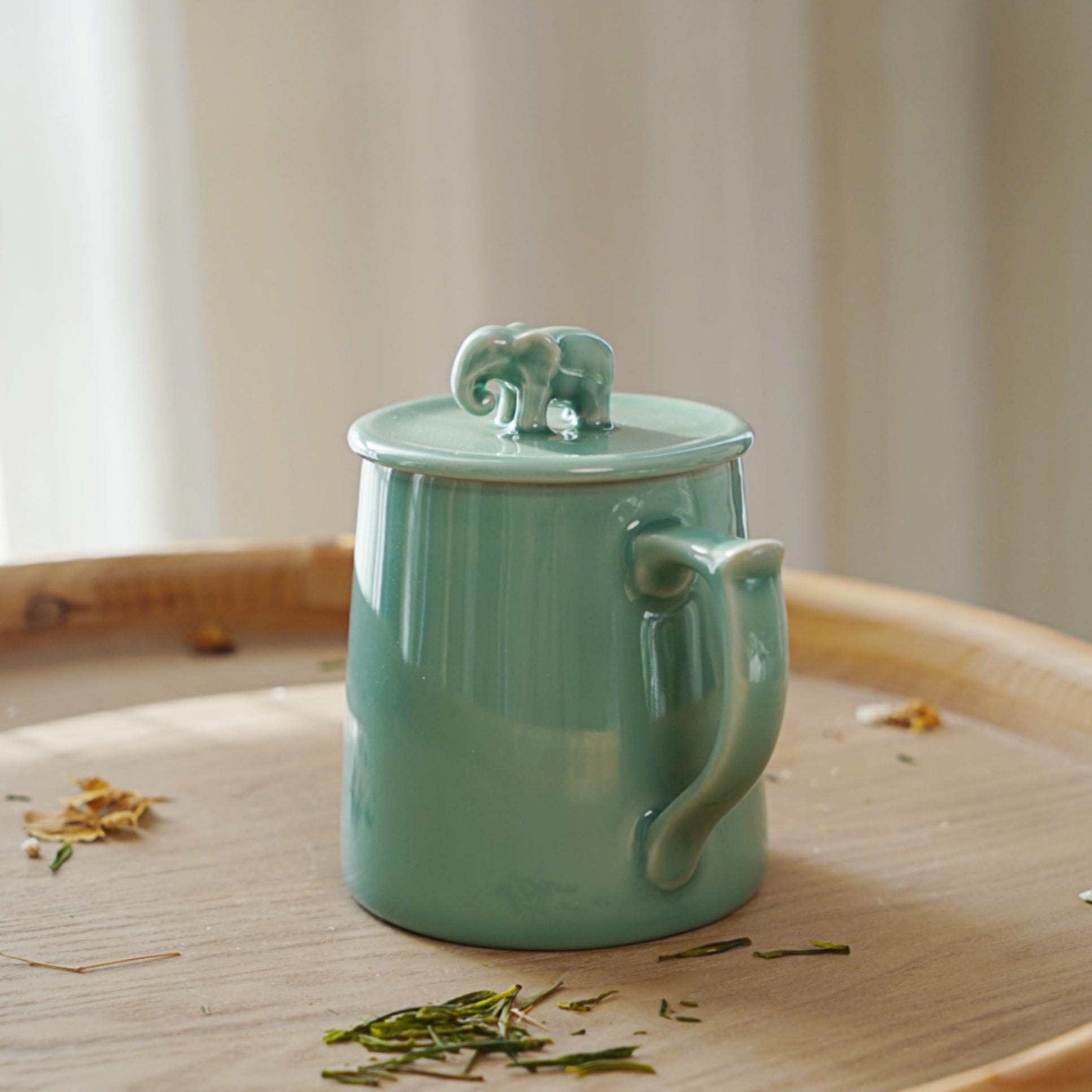 Cloud Blessing Mug · 12oz Celadon Ritual Tea Cup with Elephant Lid | Longquan Handmade Mug with Cloud Carving | Zen Gift of Strength & Peace