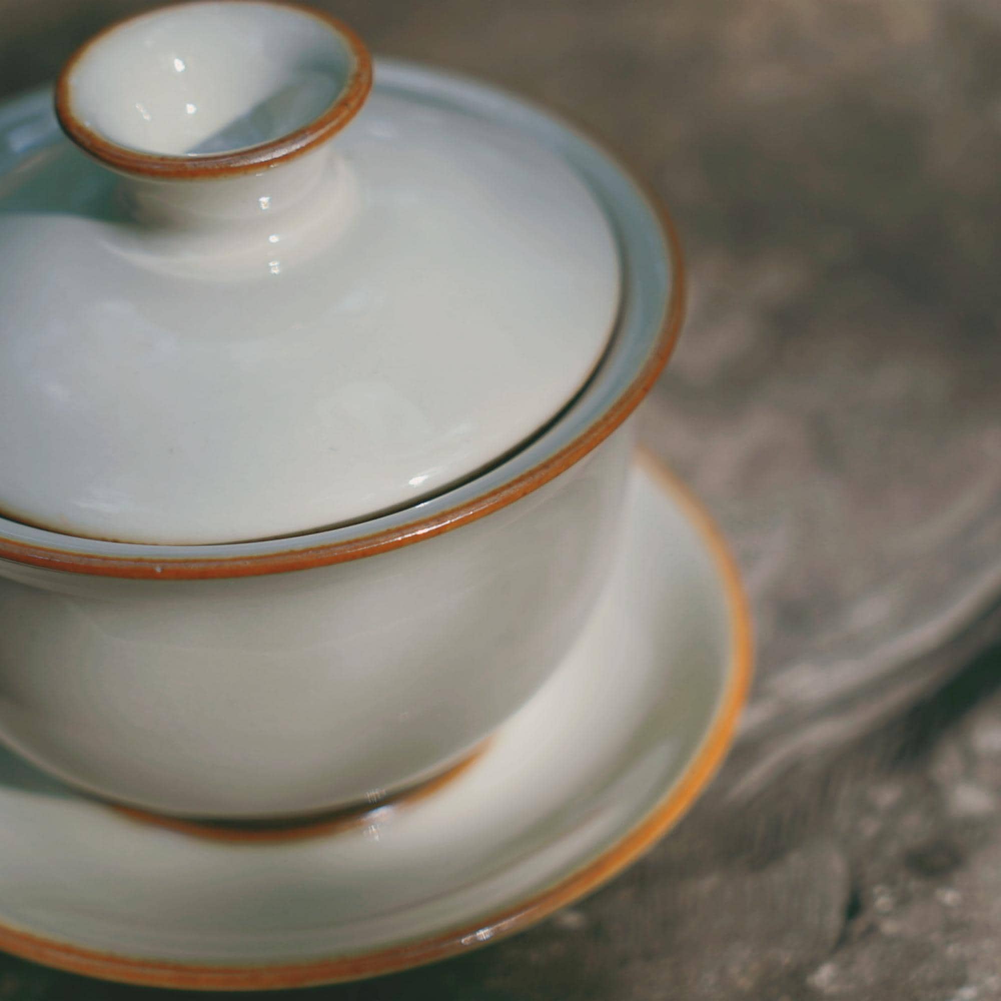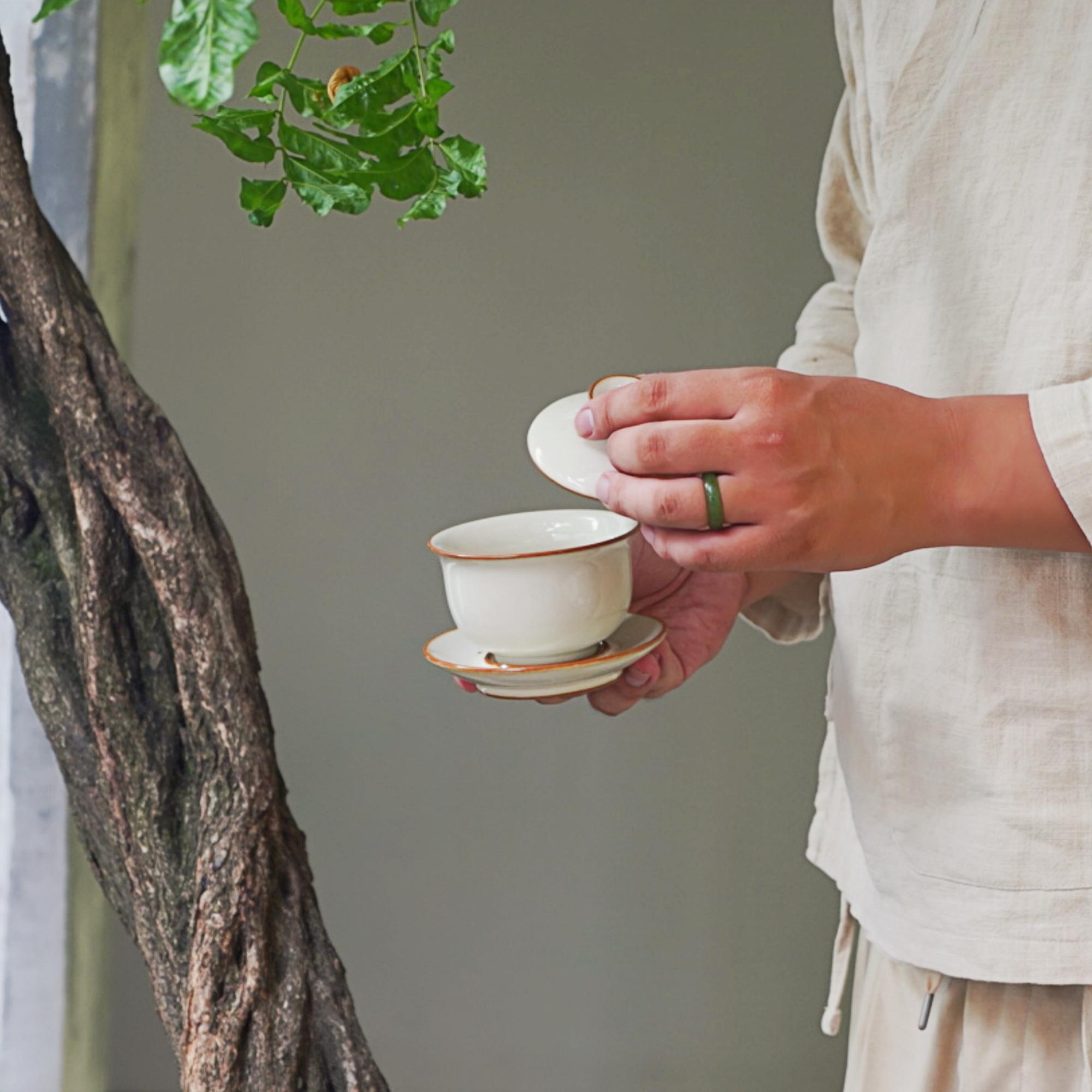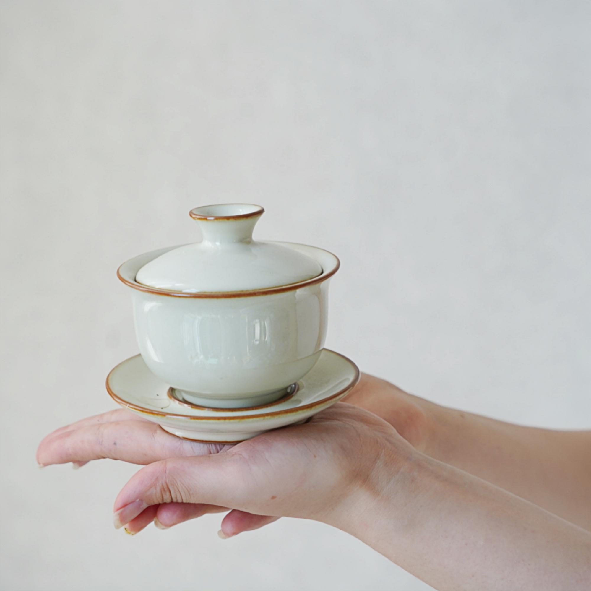 This handmade gaiwan teacup is crafted in a Longquan-inspired tradition with a warm ivory/cream glaze and an oxidized rim detail. A calm, minimalist piece for Chinese tea ceremony, daily tea ritual, Japandi or Zen-style home.