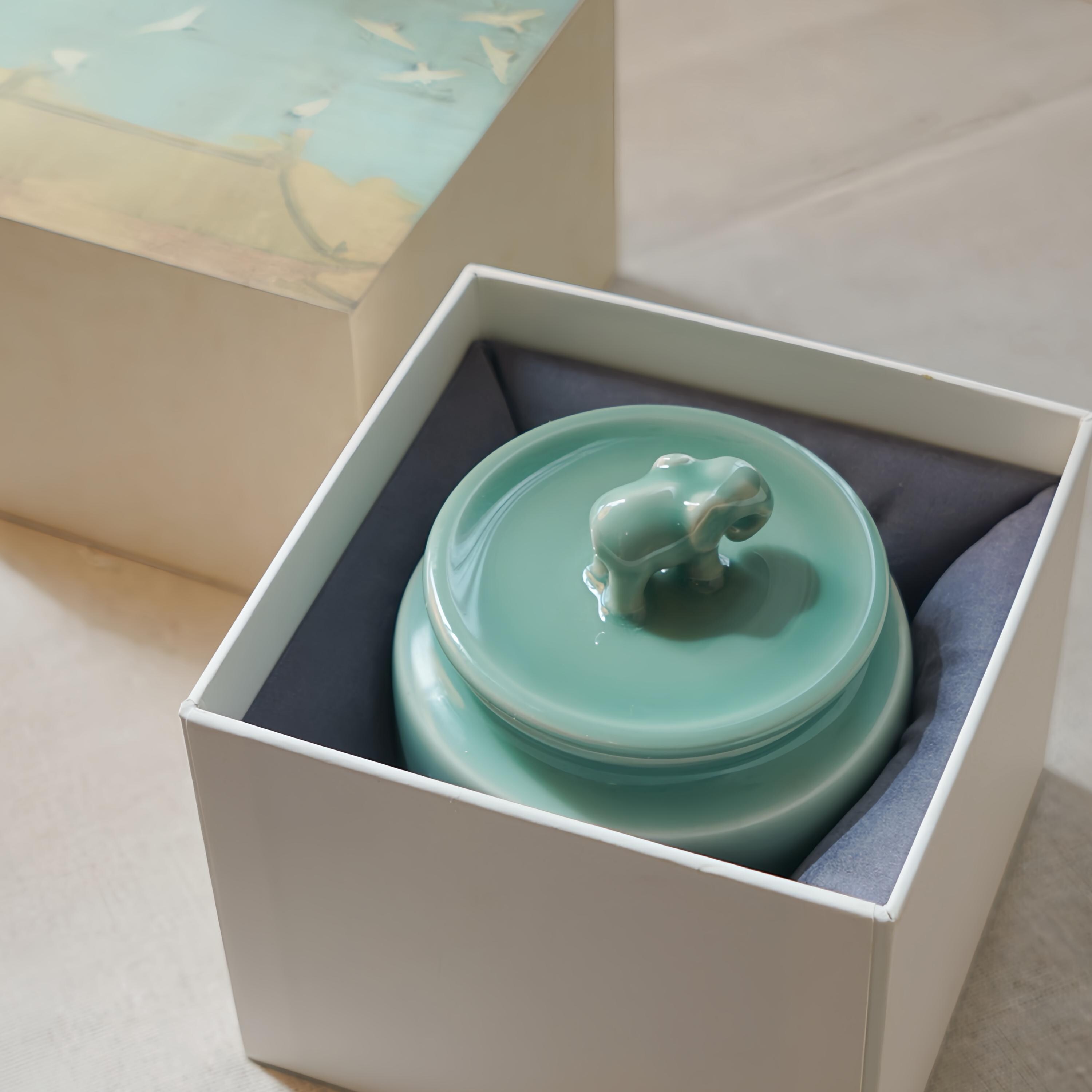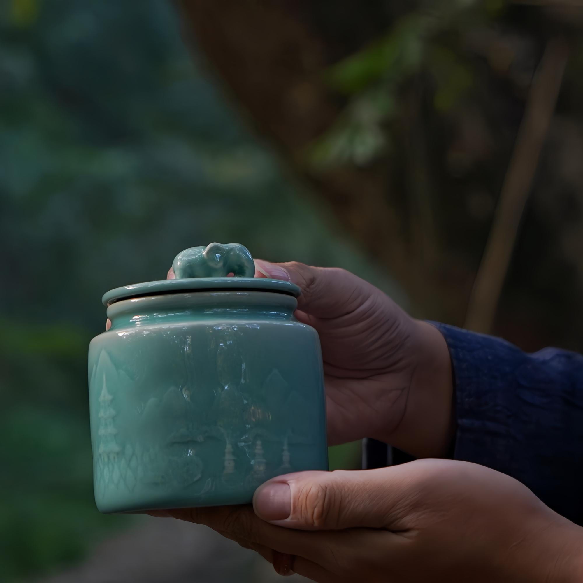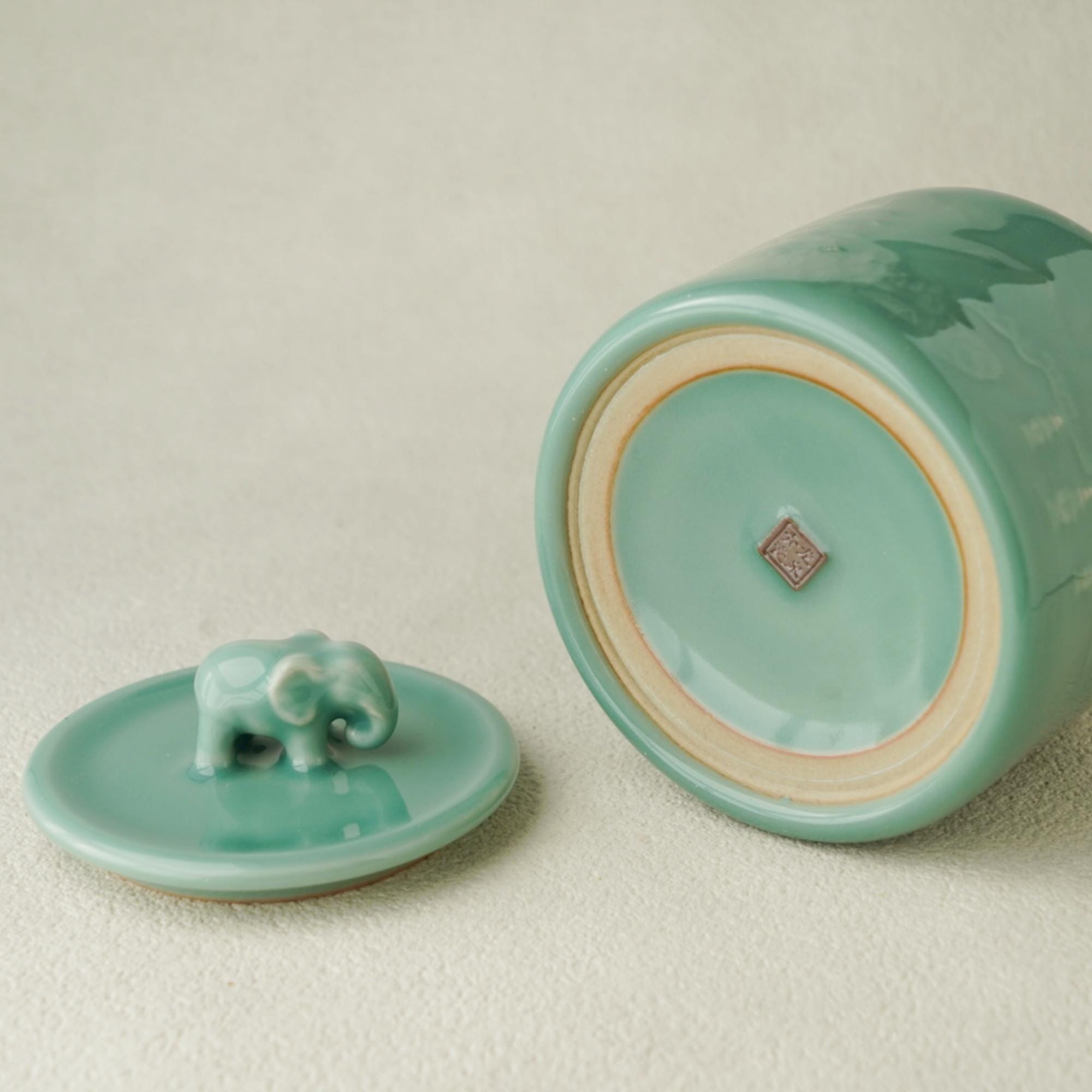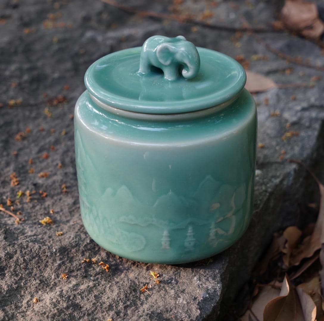 Handmade Longquan celadon tea caddy in a calm sage-green glaze, topped with a symbolic elephant lid representing peace and protection.
