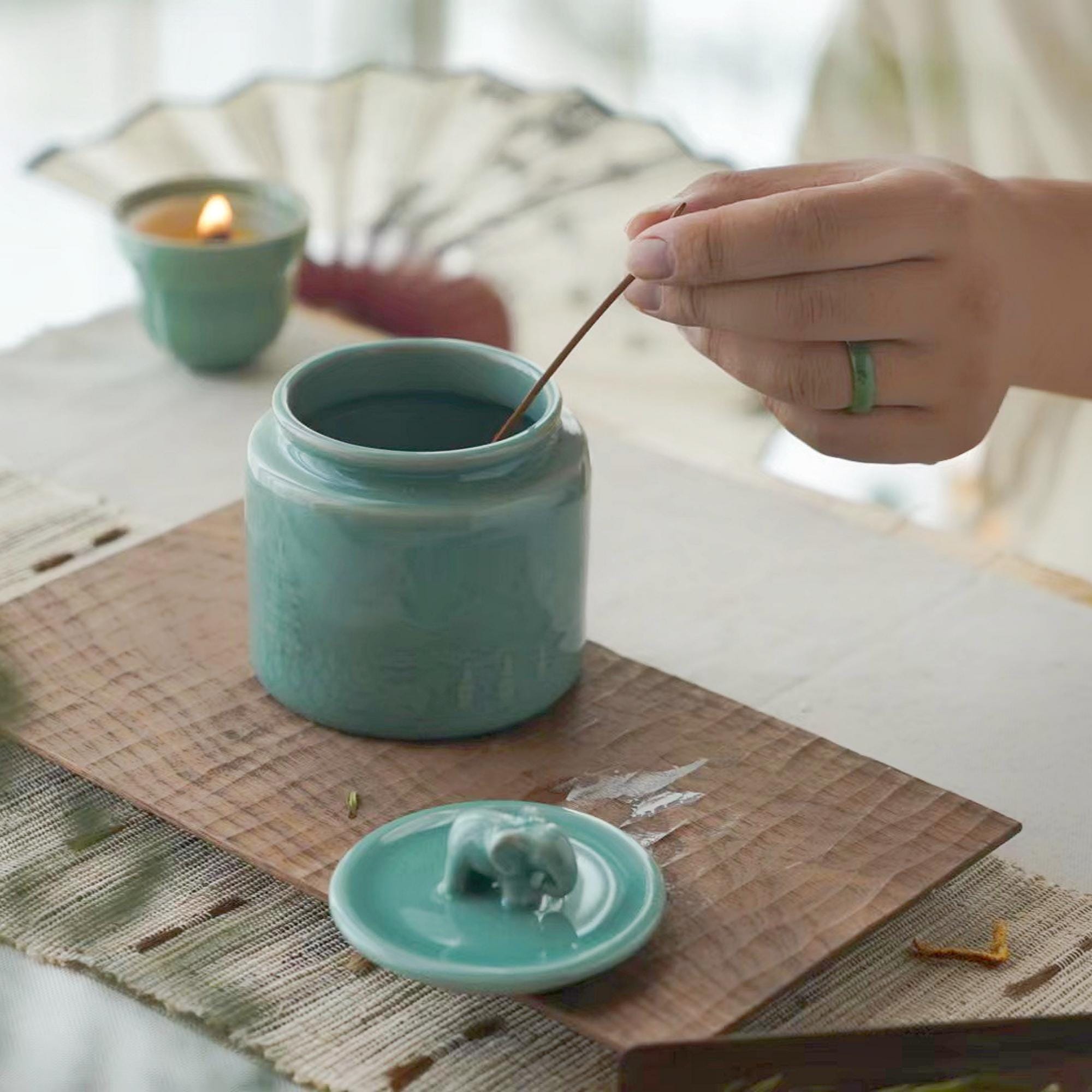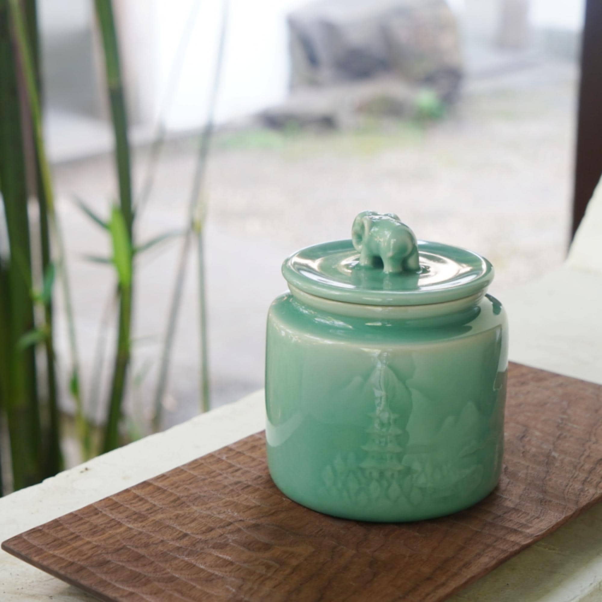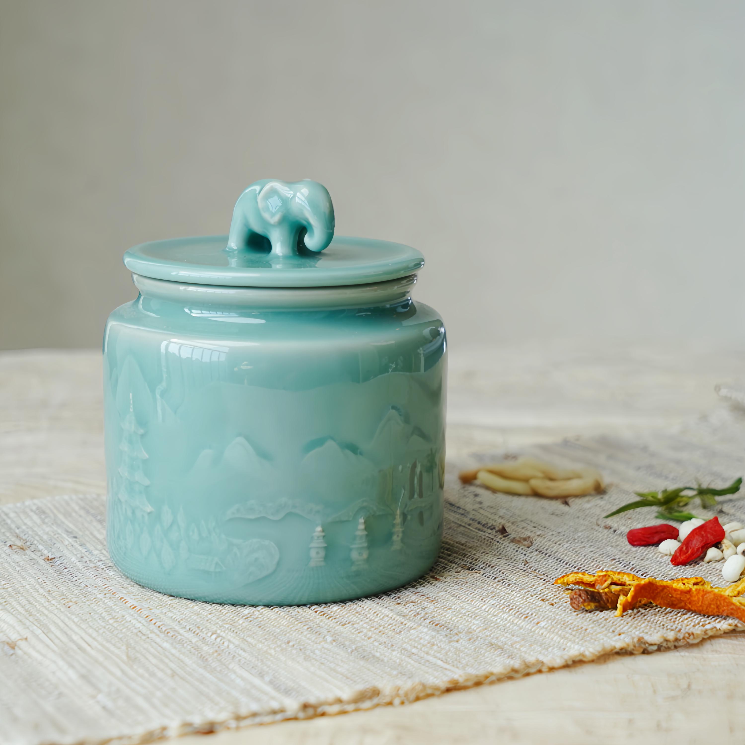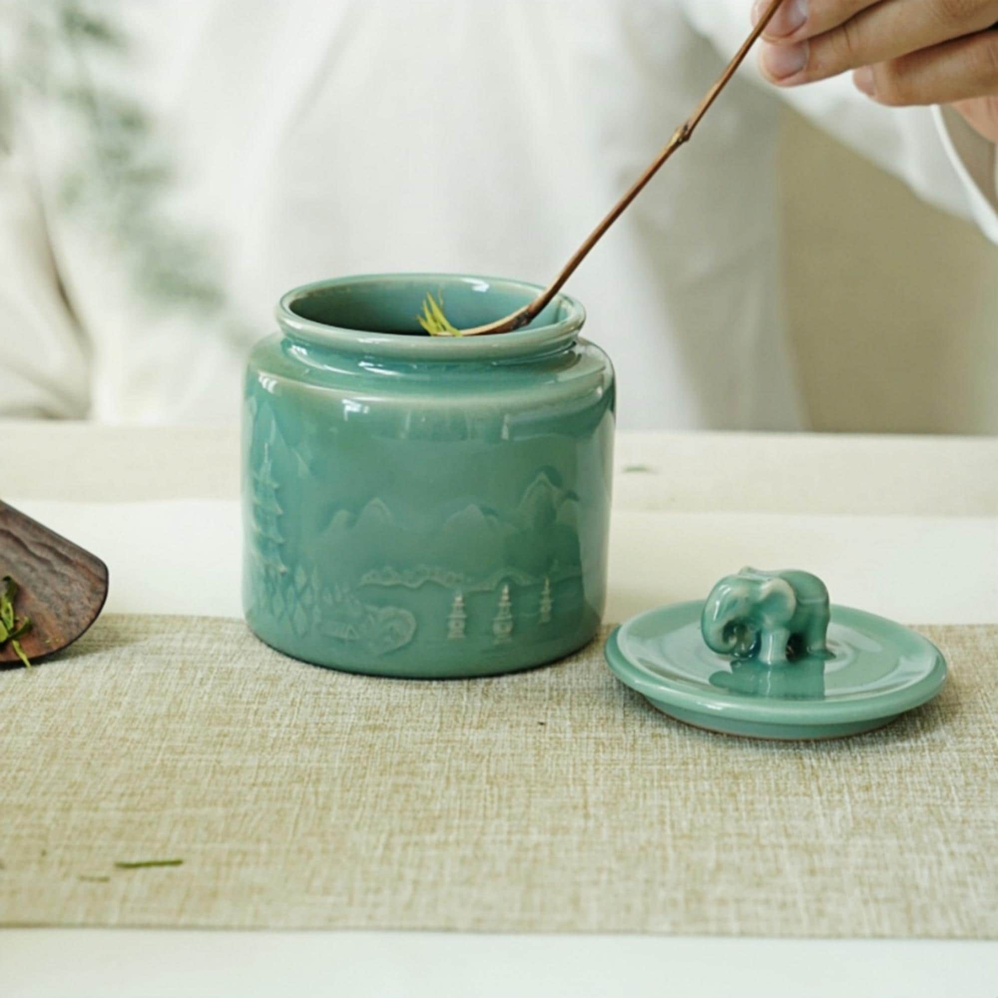 Handmade Longquan celadon tea caddy in a calm sage-green glaze, topped with a symbolic elephant lid representing peace and protection.