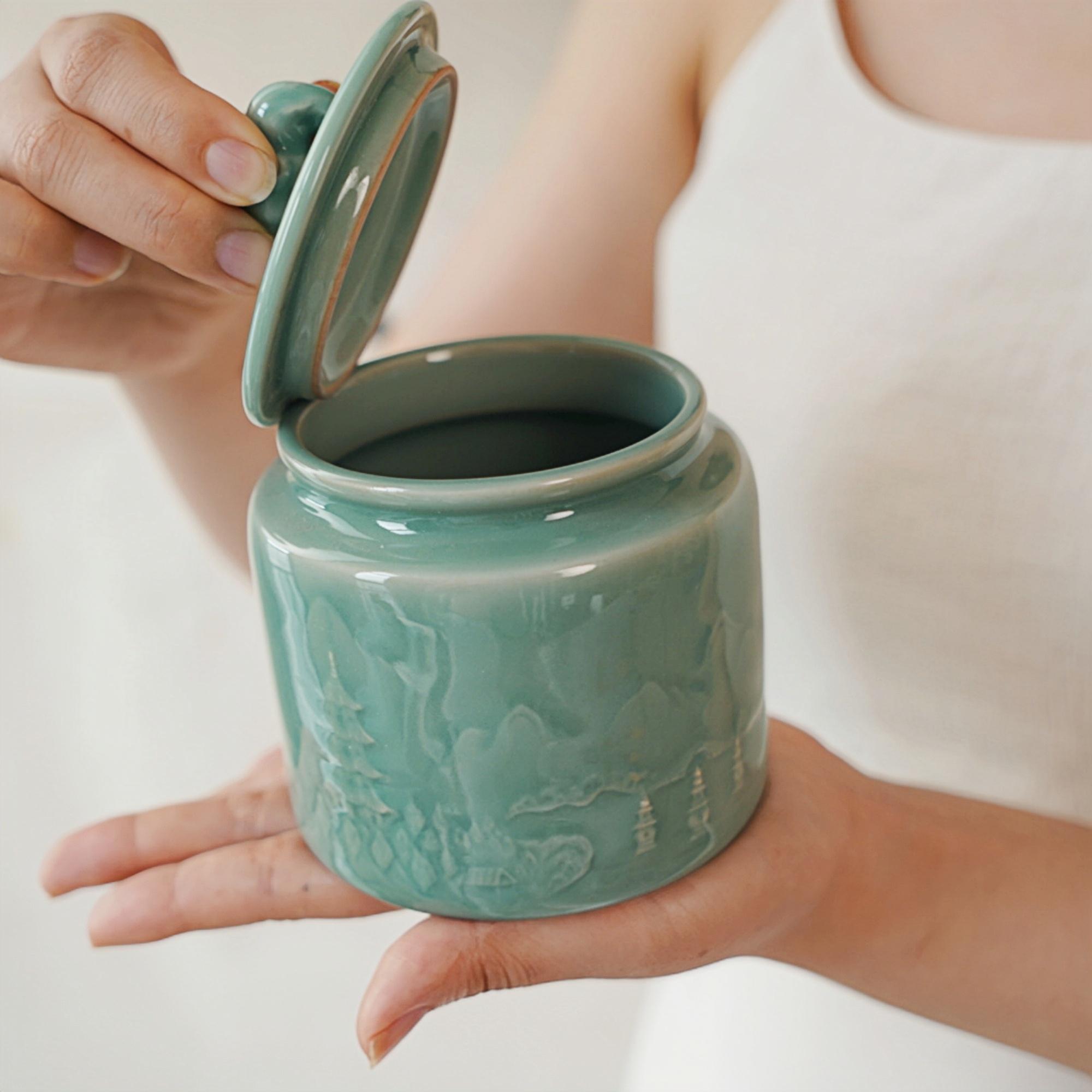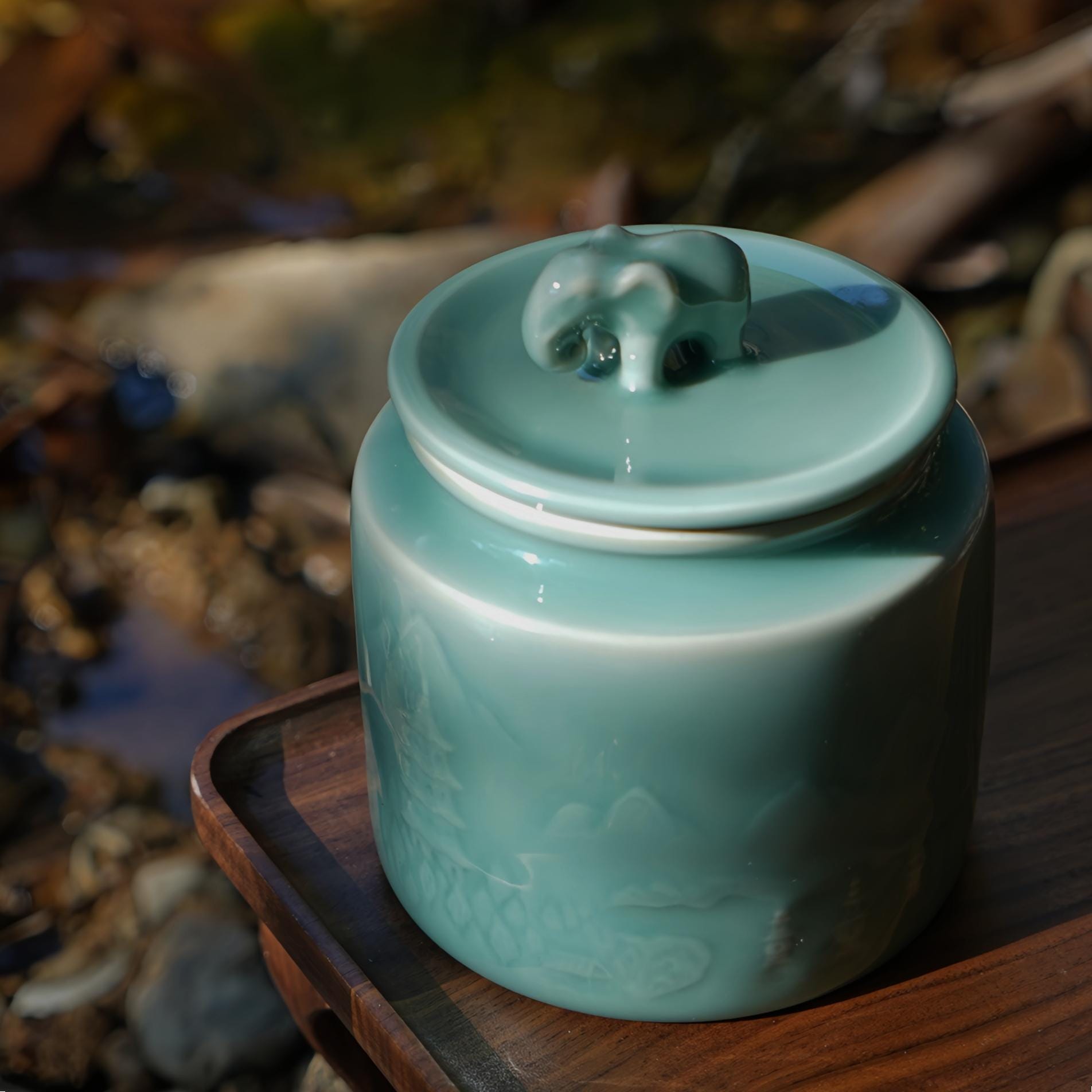 Crafted in the historic Longquan celadon tradition of Zhejiang, China, this ceramic tea canister combines centuries-old porcelain craftsmanship with modern minimalist design. The jade-like glaze and softly carved surface create a quiet presence that feels both grounding and elegant.