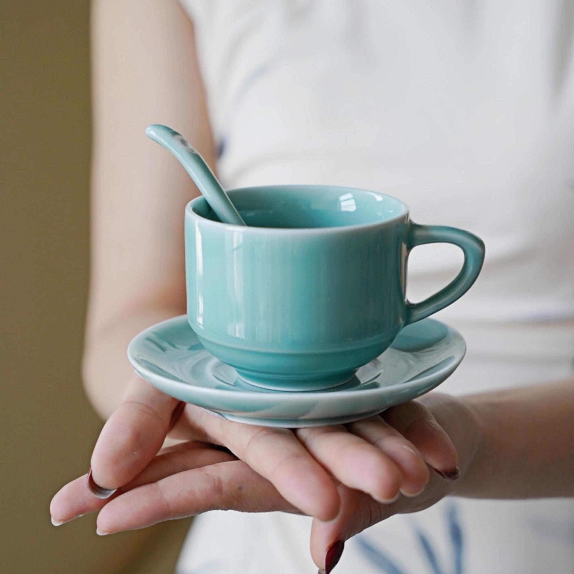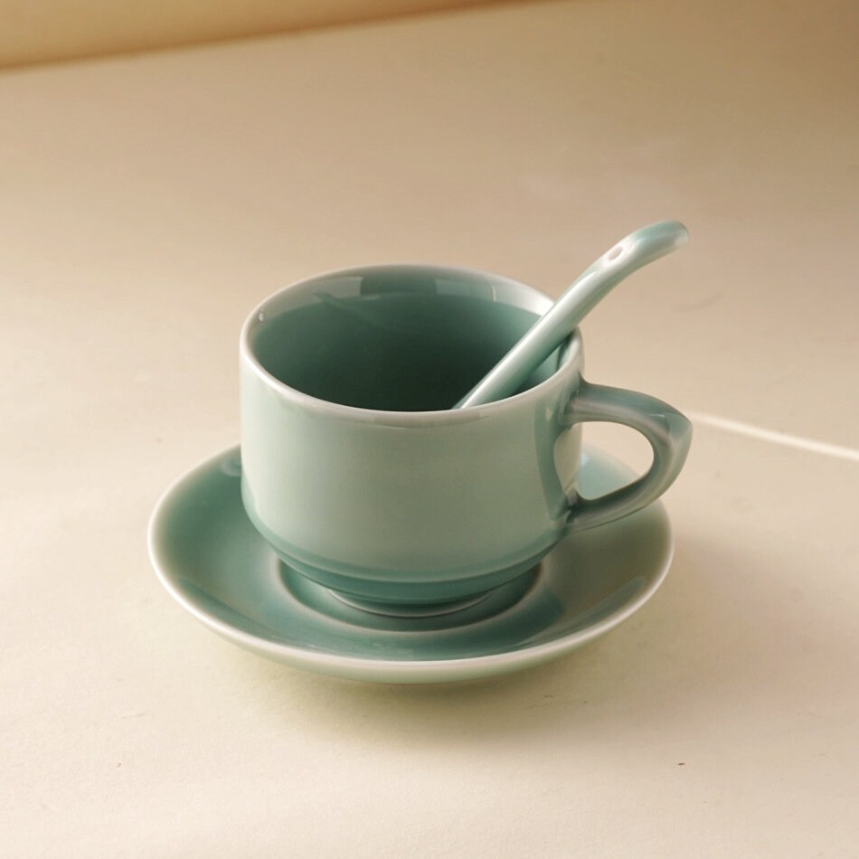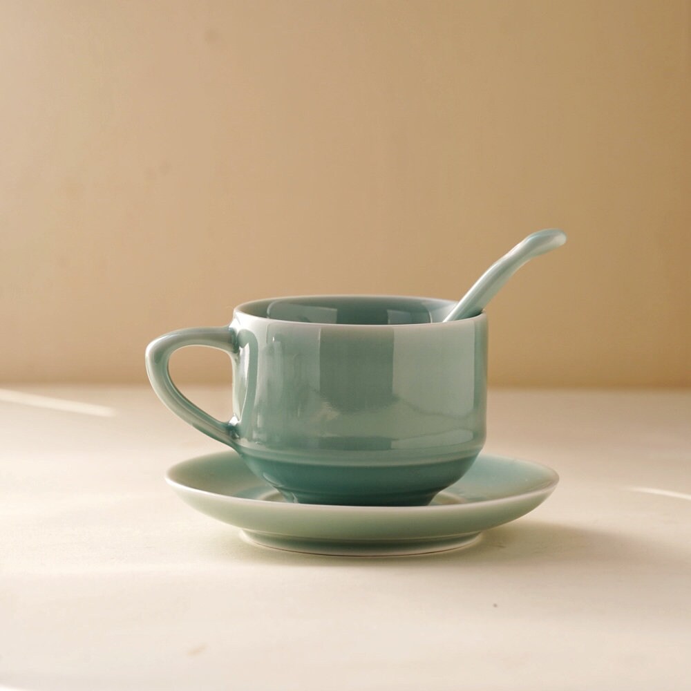 Bring calm and clarity to your daily ritual with this handmade 4oz green ceramic cup, saucer, and spoon set. Crafted with traditional Longquan celadon techniques, the soft blue-green glaze radiates serenity — an invitation to pause and savor the moment.