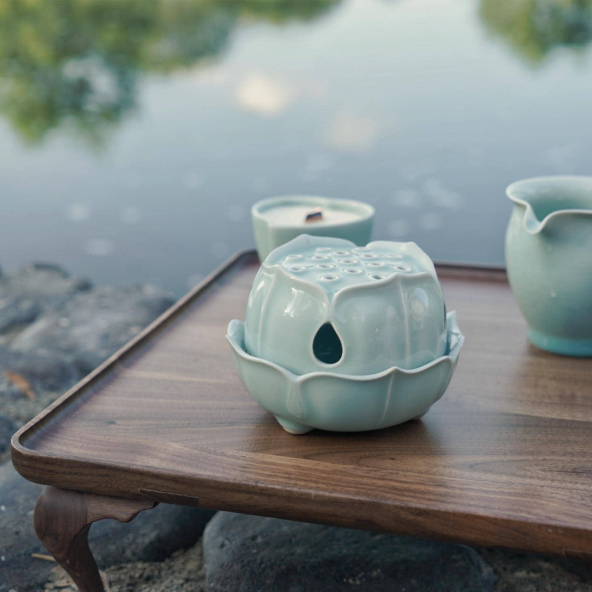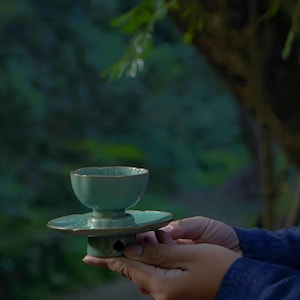 β€’ Handmade Longquan celadon, known for its translucent jade-like glaze