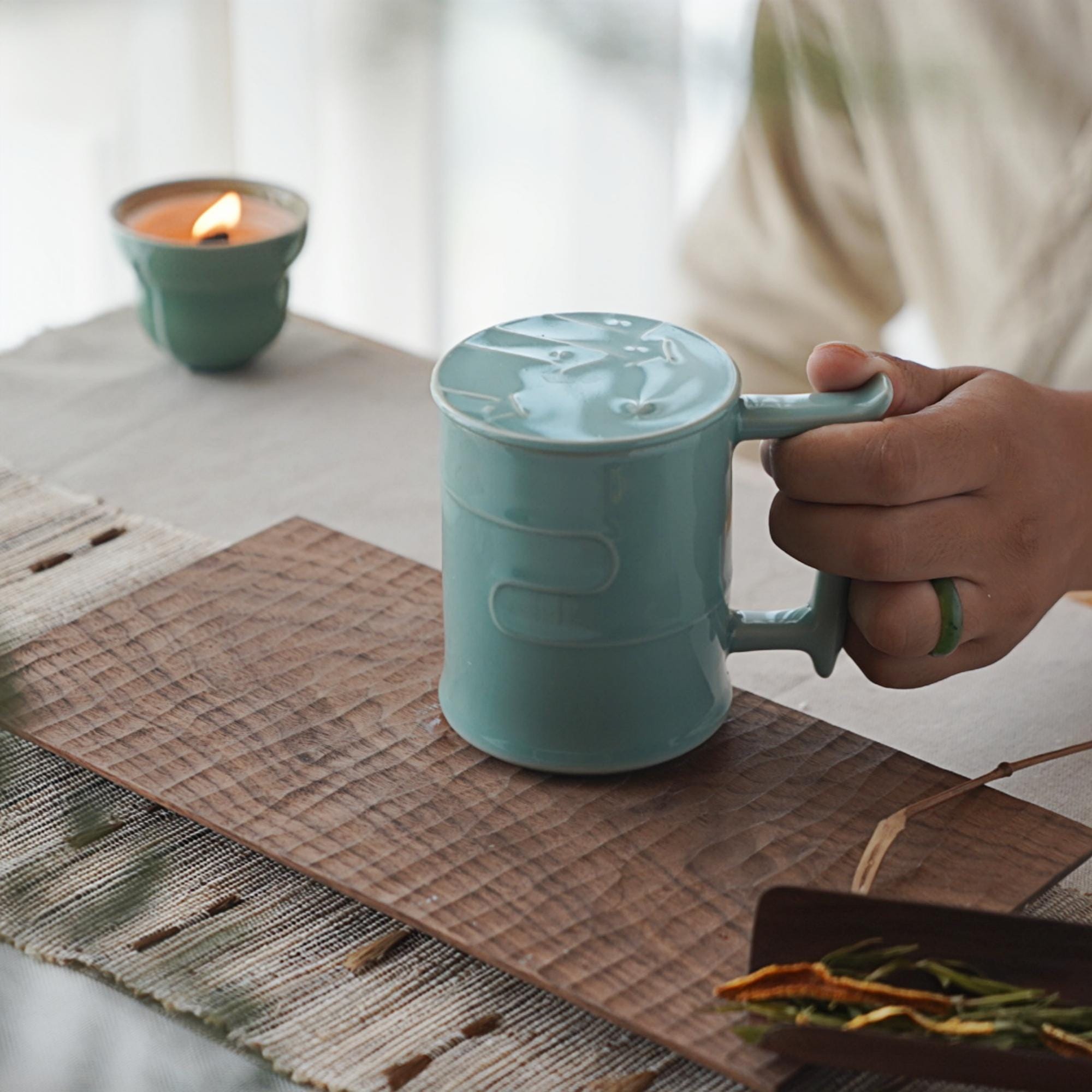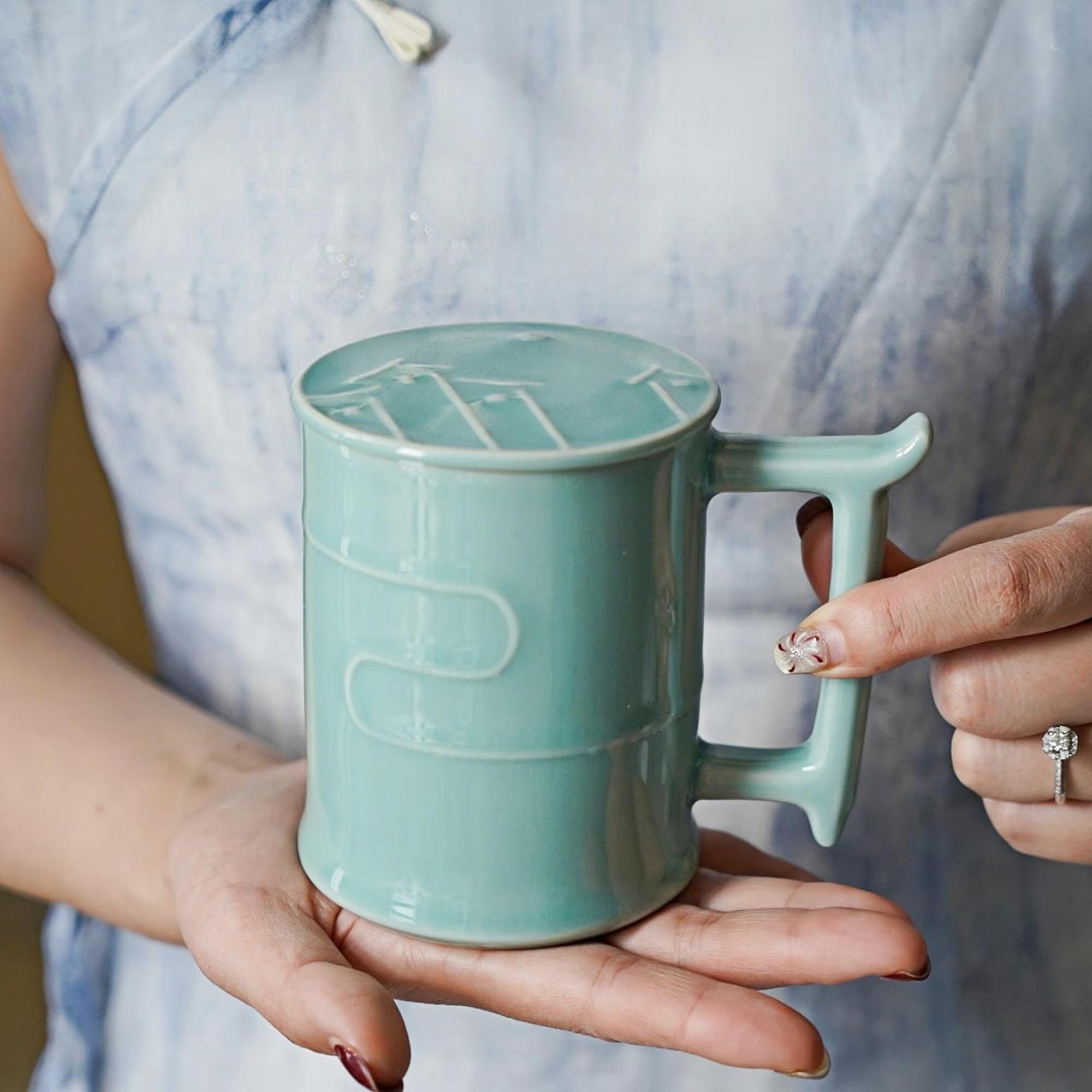 Indulge in the timeless elegance of Longquan Celadon, a UNESCO-recognized ceramic heritage that has been crafted for over a thousand years. This 350ml (12oz) handcrafted ceramic mug embodies the serene beauty of Song Dynasty aesthetics, featuring a delicate engraving of traditional Chinese architecture on the lid and an ergonomic handle inspired by classical design.
