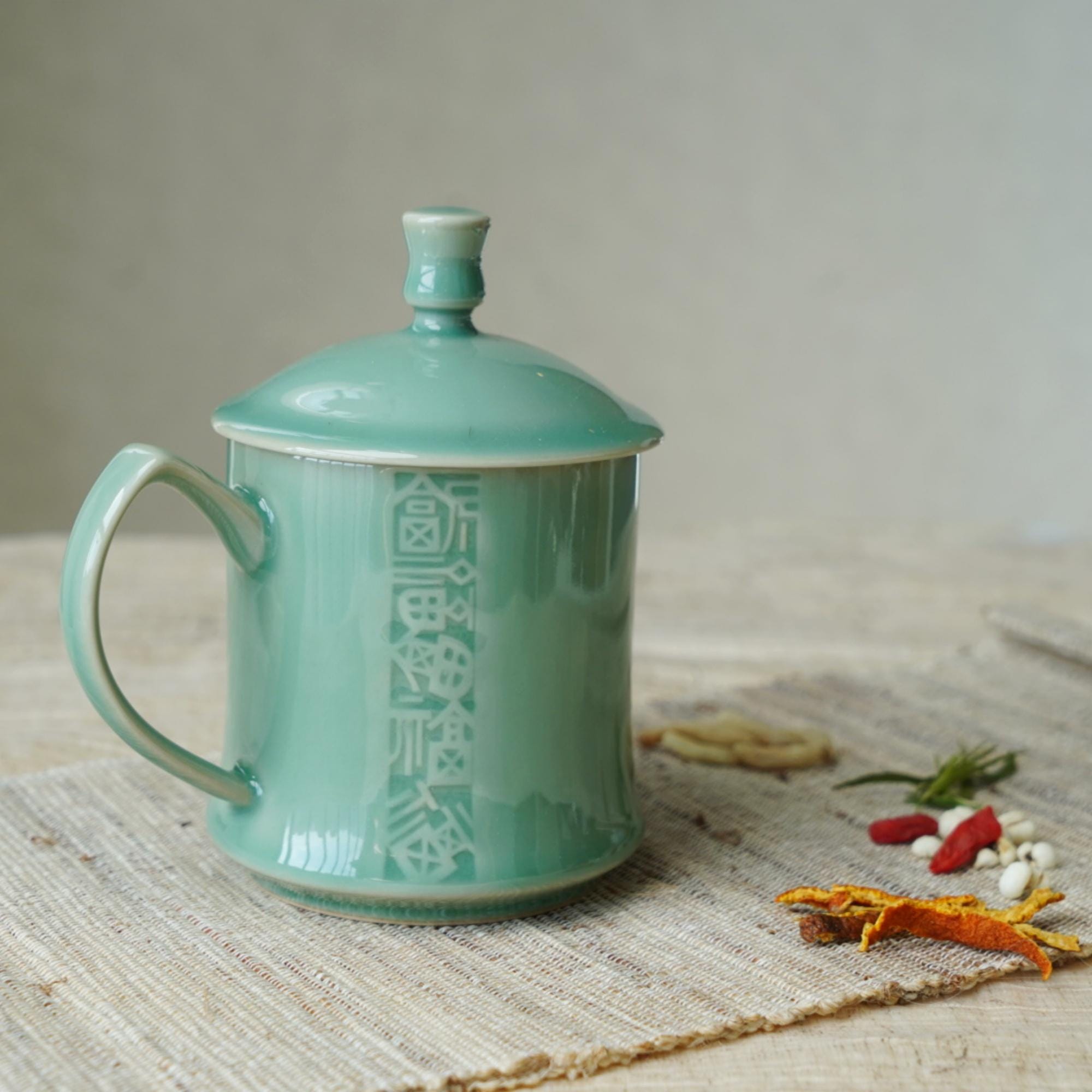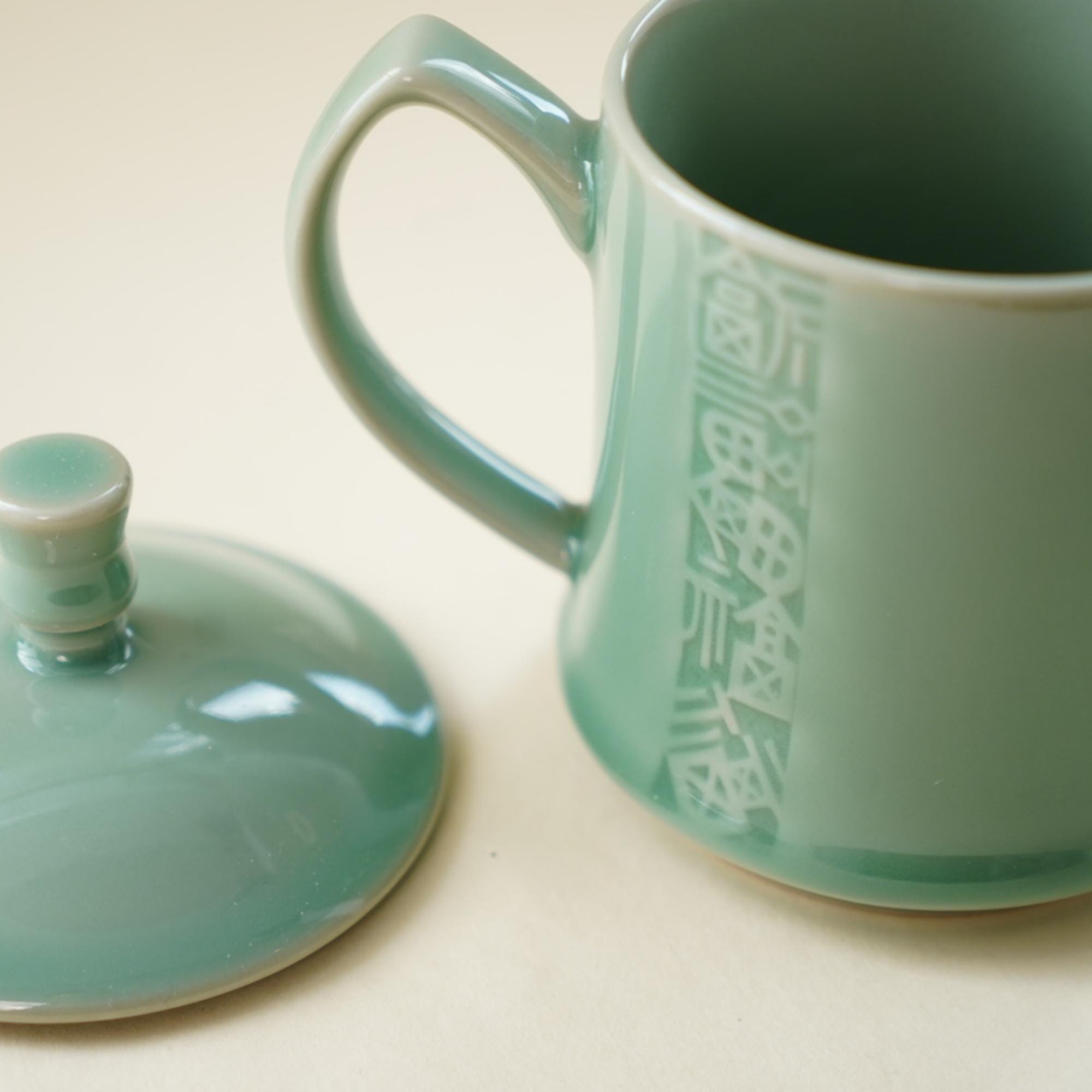 This 12oz celadon tea mug is engraved with the ancient Chinese "Five Blessings" β€” longevity, wealth, health, virtue, and a peaceful end. A timeless message of well-being, crafted into a daily-use object. Ideal for morning tea, afternoon herbal infusions, or mindful sips in quiet moments.