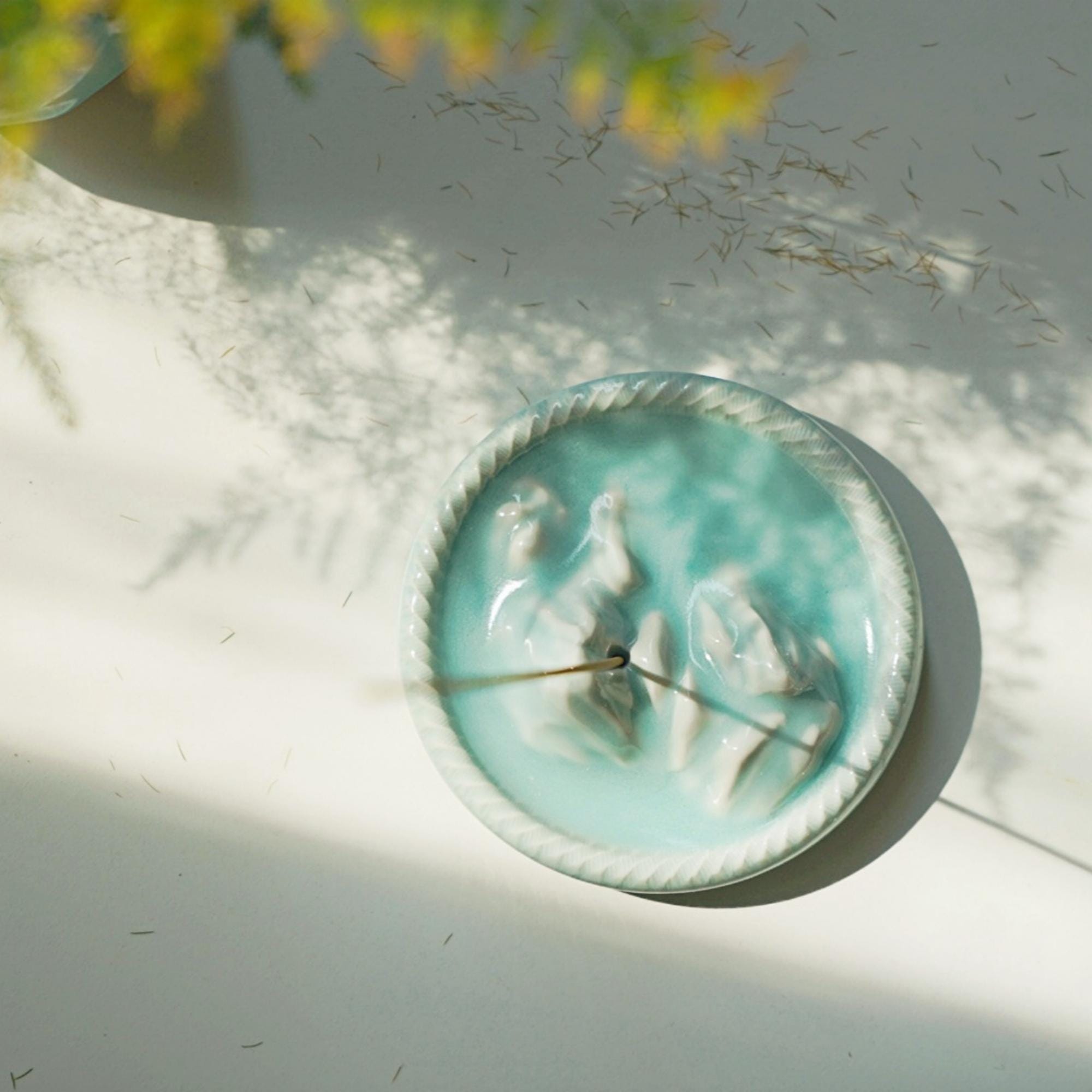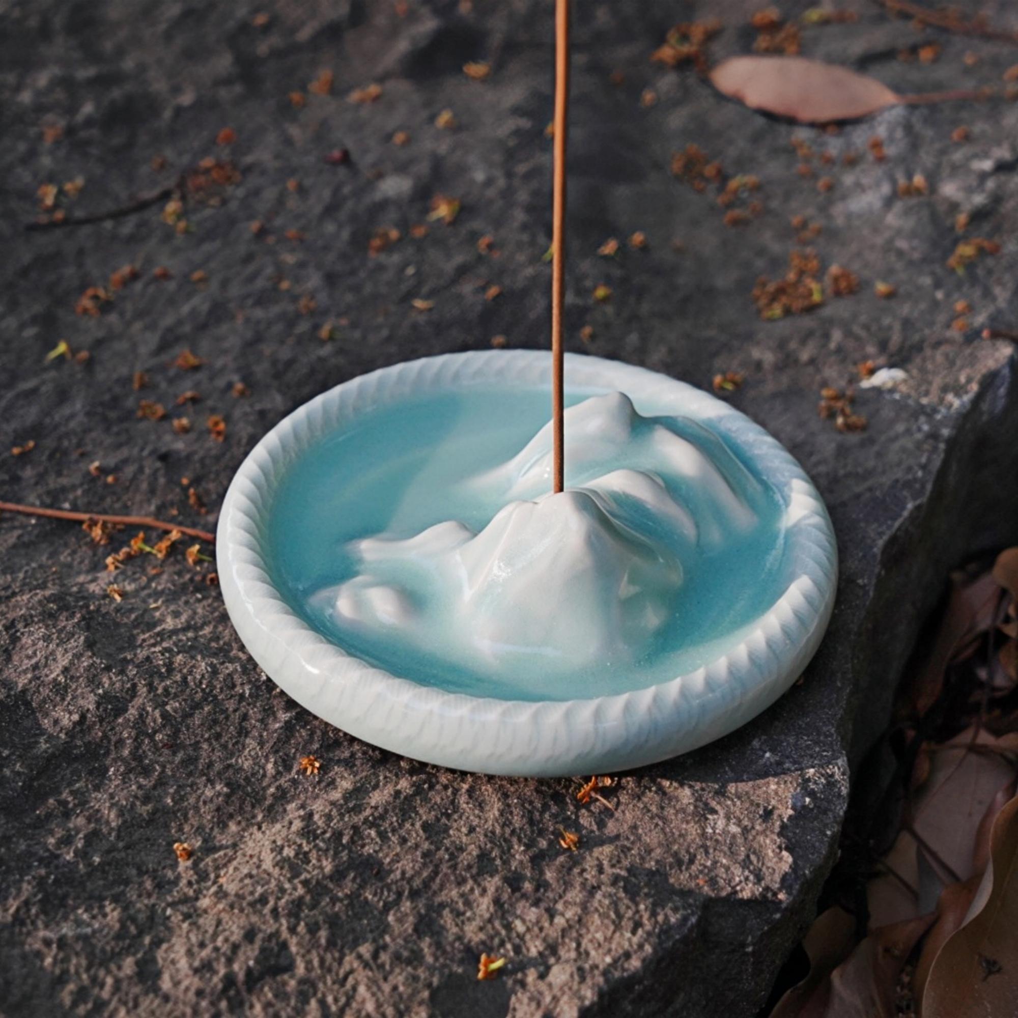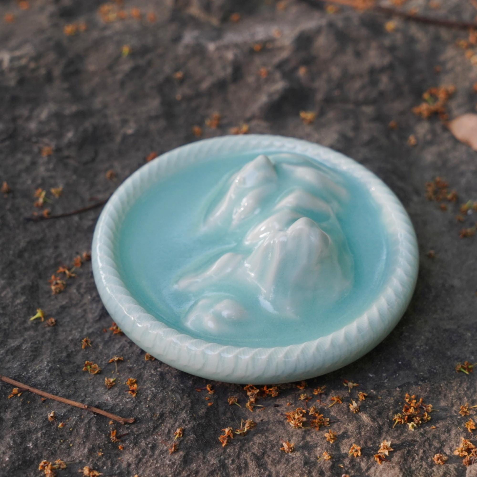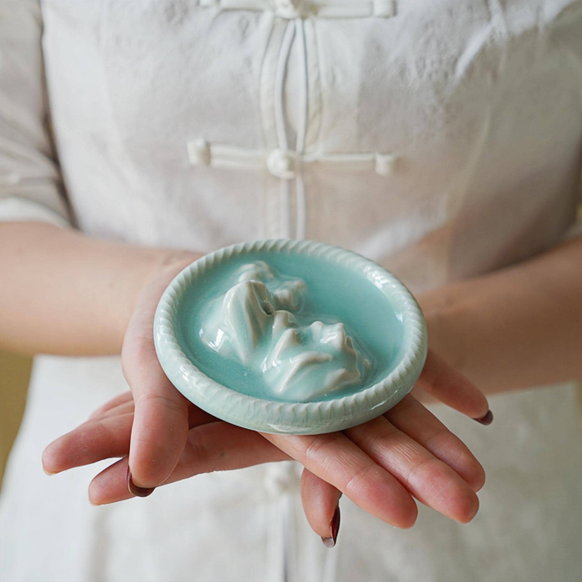Bring a quiet mountain breeze into your space with this handcrafted celadon incense holder plate, inspired by the calming lines of nature and ancient oriental aesthetics. Each piece is carefully shaped and glazed to echo the serenity of the Zen tradition, with a unique mountain sculpture motif that holds both incense sticks and cones.
