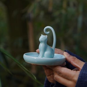 Celadon Cat Ring Dish, Handmade Jewelry Holder, Wedding & Engagement Gift for Her, Japandi Zen Decor